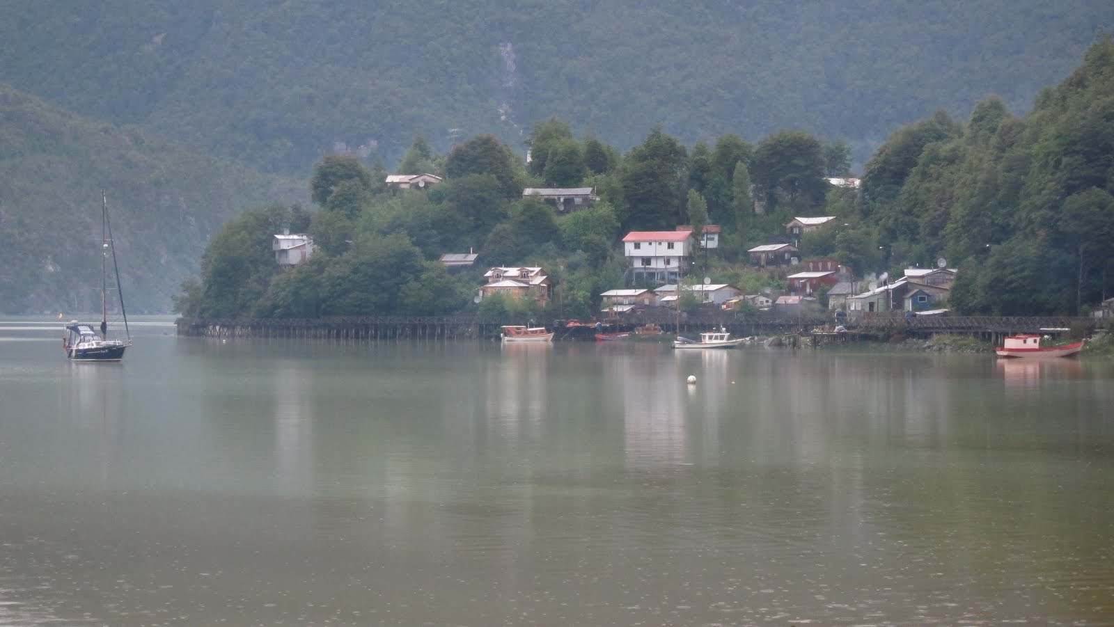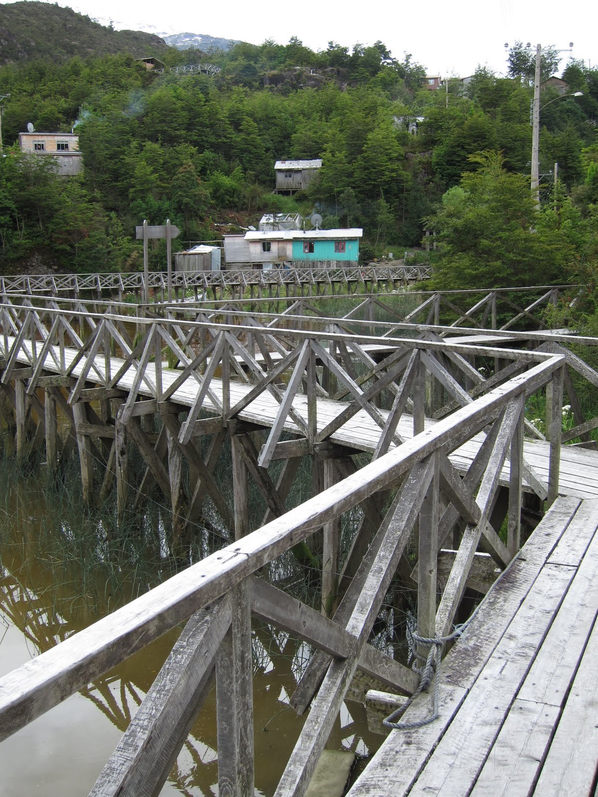 The rainfall only briefly paused between about 9.30 and 11am the following morning, so the next day's cycling was tough. As Pob's knee still wasn't in top form, my bike now carries the tent, which was extra heavy from all the rain. We met 3 pairs of cyclists heading north and each time we quizzed them, in the increaingly heavy rain, about how far it was to the junction off to Tortel - they had all come direct from Puerto Yunguay that day. By this time, completely soaked through - including supposedly waterproof gloves and jackets, both Pob and I were dreaming of a warm hostel bed in Tortel, drying off our cycling clothes, tent and most of all, our sopping shoes. So we decided to go for PB of ripio distance. What should have been a very pretty ride was somewhat marred by some serious rain in the late afternoon, and the countless waterfalls lost their appeal, but ~48miles later, we made it.